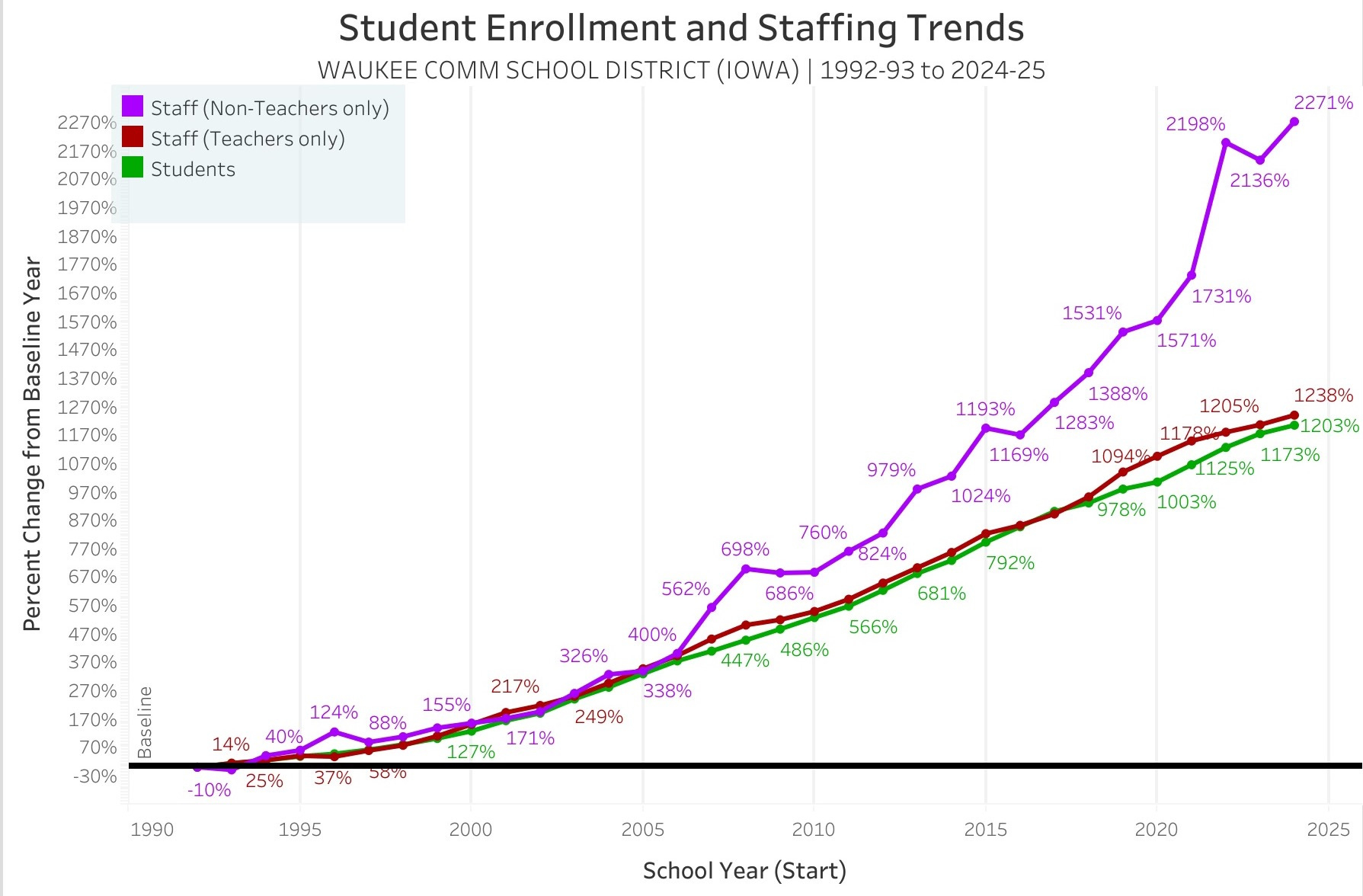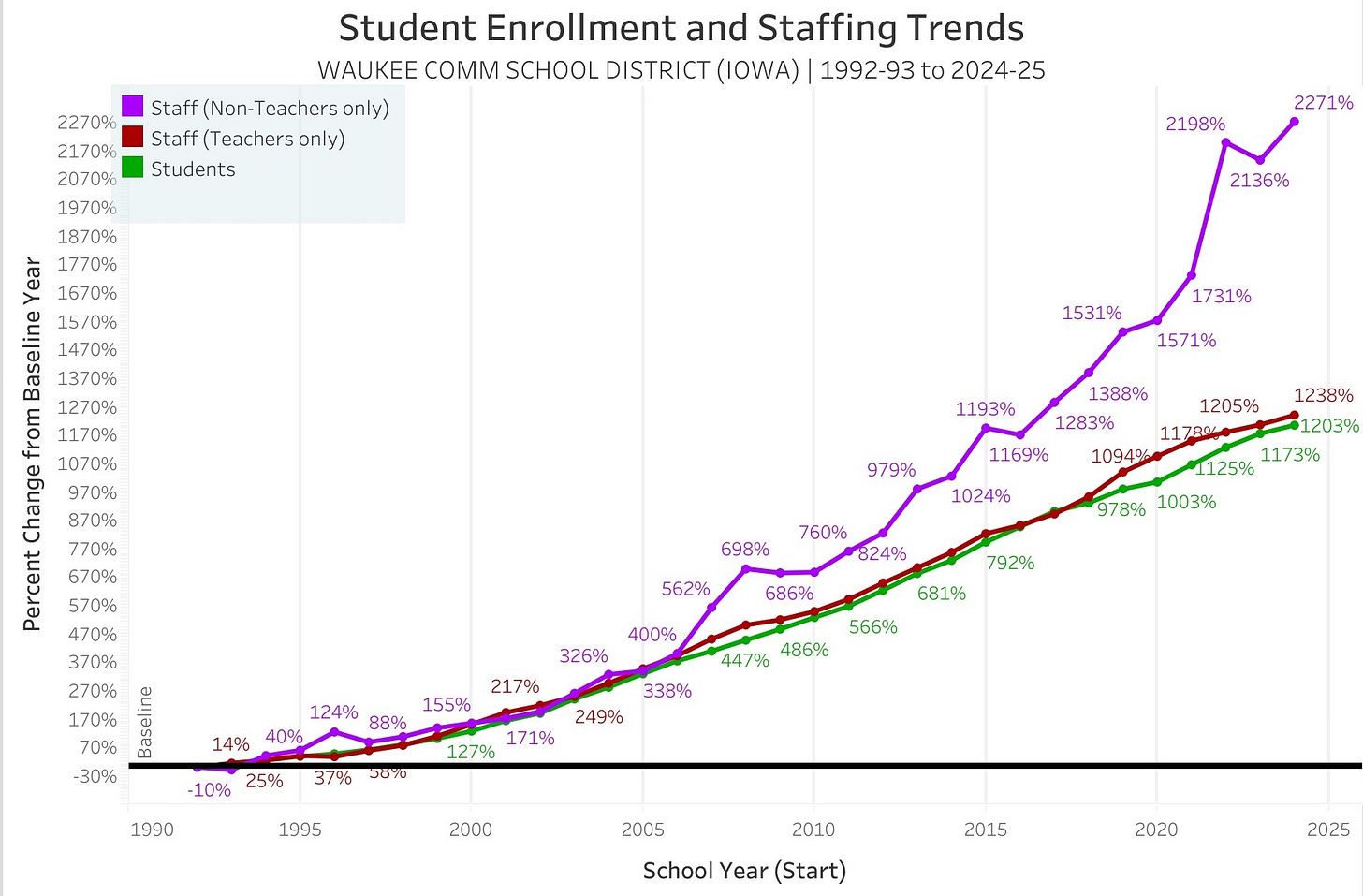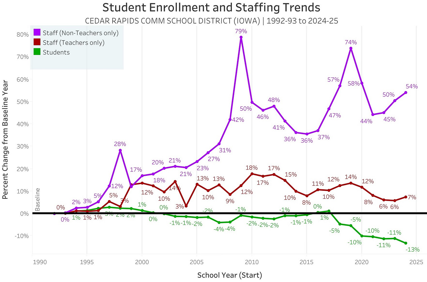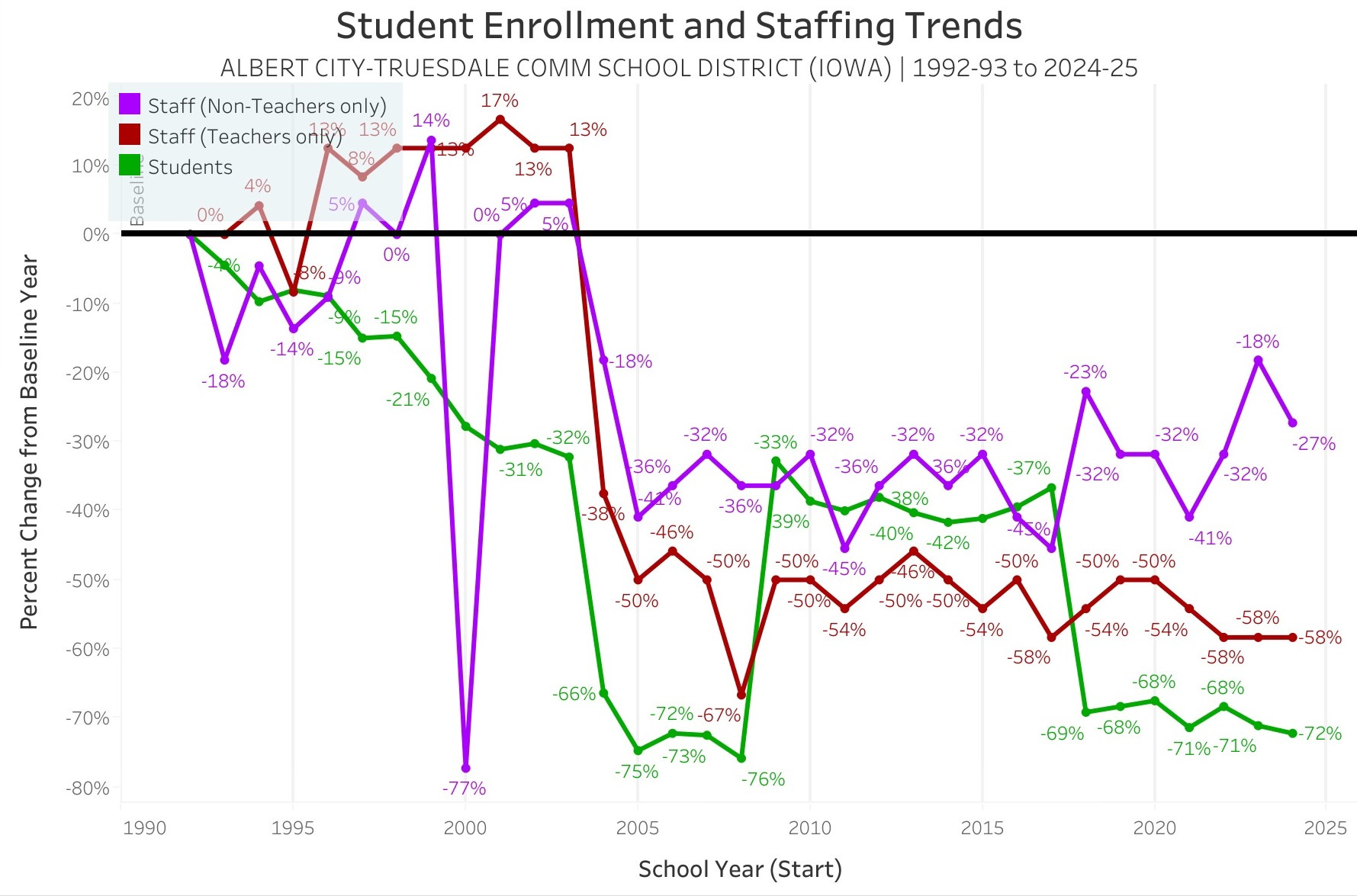 It is also important not to misapply this critique to Iowa’s smallest districts. In places like Albert City–Truesdale or Clay Central–Everly, enrollment has declined sharply—often by 40% to 60% or more—and staffing has declined as well, but only to a point. Schools must maintain a minimum number of teachers, administrators, and support staff to function.
