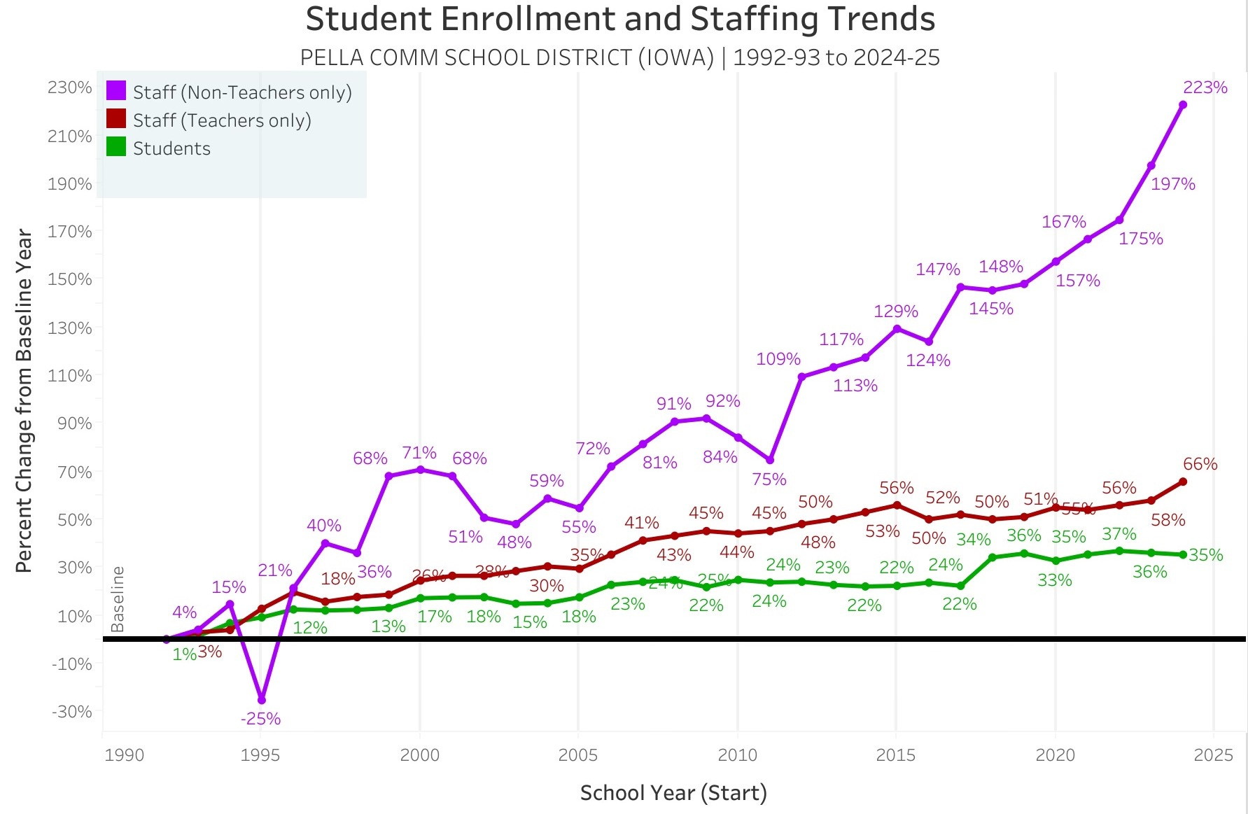 This is not just a large-district story. In mid-sized districts, the pattern is less dramatic but still clearly present. In Bondurant-Farrar, enrollment has grown steadily and teacher staffing has increased in step, but non-instructional staffing has grown faster than both. In Pella, where enrollment has been relatively stable, modest growth in teachers is accompanied by more significant growth outside the classroom. In Boone, where enrollment has been flat or slightly declining, staffing has not contracted accordingly, and non-instructional roles have continued to expand.